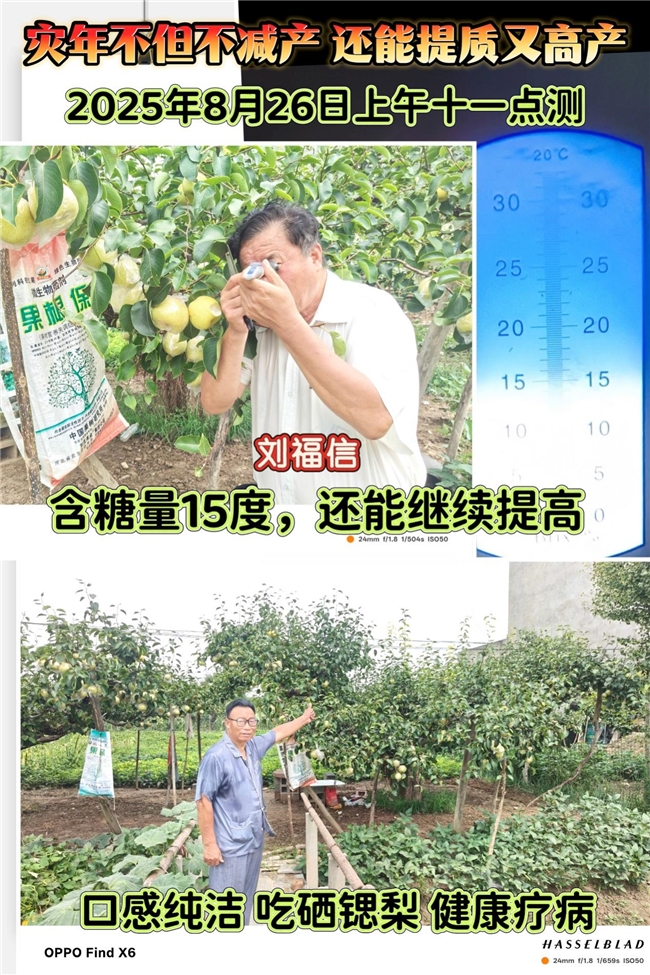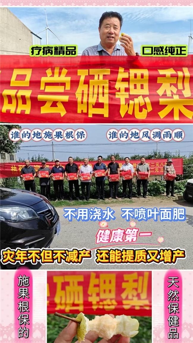 刘氏果业集团有限公司与武汉华硒生物科技有限公司,联手在河南夏邑孔庄乡苗厂村创新一个硒锶梨生产基地,由刘氏果业提供微生物菌肥一一果根保、华硒公司提供富硒液。