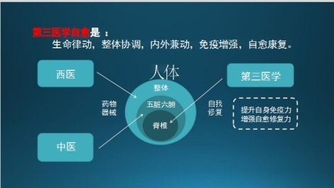 倡导人人自检、自醒、自救、自愈的大健康之道!它属于预防医学和自愈医学的范畴。第三医学的核心之一是运动自愈康复学科——生命律动养生法。人是一个统一的有机体,生命是有机体的整体活动。一般的运动方法达不到全身整体协调之效果,一招一式不能使其肌体整体协调,单一的运动方法代替不了整体性运动。生命律动,整体协调,内外兼动,免疫增强,自愈康复。