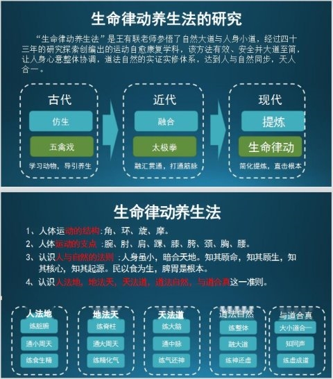 第三医学的领路人——人体生命科学的探索者王有联教授经过四十几年的研究探索总结,参悟了自然大道与人身小道,创编了全新的运动自愈康复学科“生命律动养生法”,该方法包含一系列高效、有效、安全并大道至简的运动方法。每个动作从自检开始(查病)、自醒(唤醒健康意识)、自救(采取自救行为)、自愈(身心意整体协调),让整个人体有序化,规律化,科学化地达到统一协调,直到天人合一。