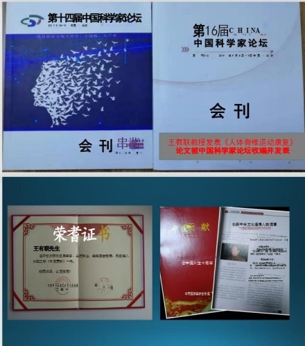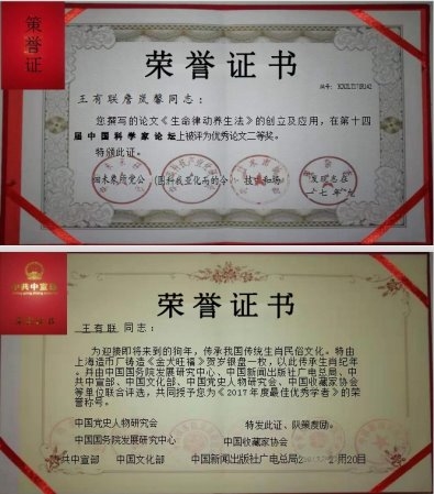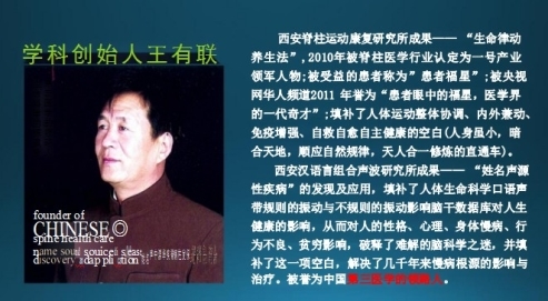 王有联教授四十多年在人体生命科学探索领域,宁可付出一人之苦,为人类的大健康提供预防医学与自愈医学而不懈地努力,以科学严谨的态度、淡泊名利的胸襟,专注于人体生命科学领域的研究、实践与探索,在漫长的艰辛岁月之中,逐步完善并取得了全新的科研成果——“生命律动养生法(人是一个生命的有机体,整体协调,内外兼动,免疫增强,自愈康复)”和“姓名声源性疾病”(姓名文字组合,口语声带振动,规则时利于人的各项发展及身体健康,否则会给人带来很大的不良影响,如身体不健康多病),并使之应用于实践之中,给人类大健康事业做出了举世无双的重大发现与贡献,让人们从被动的已病治愈,逐步走向提前预防与主动的运动自检、自醒、自救、自愈的道路上来。