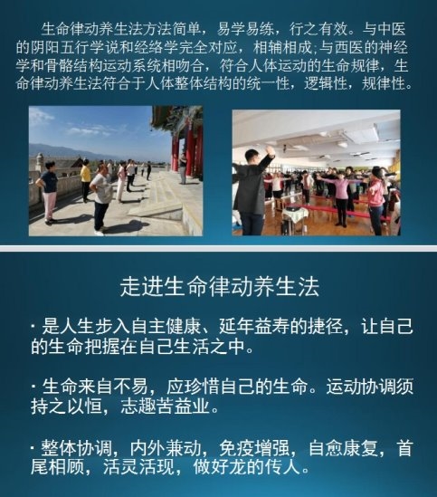 3、致力于生命律动养生法的研究探索进一步对人体不同的疾病用不同的运动方法来进行自愈康复调节。