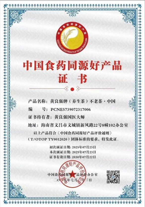 北京国医馆海南海天分馆黄良强国家级中医大师,中医药养生,黄良强牌养生茶《不老茶》吉雷斯世界纪录金奖。天下长寿美容茶纯鲜,活性,无毒。〈组成〉不老树叶,诺丽叶,葛根,山楂,杜仲,红景天,黄芪,等。