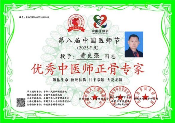 为全面推动大健康产业发展,响应习近平总书记“没有全民健康,就没有全面小康 ”和“要倡导健康文明的生活方式,树立大卫生、大健康的观念,把以治病为中心转变为以人民健康为中心,建立健全健康教育体系,提升全民健康素养。 ”以及“要秉持人类卫生健康共同体理念,推动构建人类命运共同体 ”的号召。为深入挖掘临床一线及基层中医药服务能力建设中涌现出的先进典型,弘扬“大医精诚 ”精神,讲好中医故事,传递中医正能量,使百姓更加爱中医、信中医、受惠于中医。迎国庆特别报道国际权威中医正骨治疗,颈椎病、头晕、头疼、胸闷、肩围炎、腰椎间盘突出、坐骨神经疼、痛风等医学专家——黄良强。