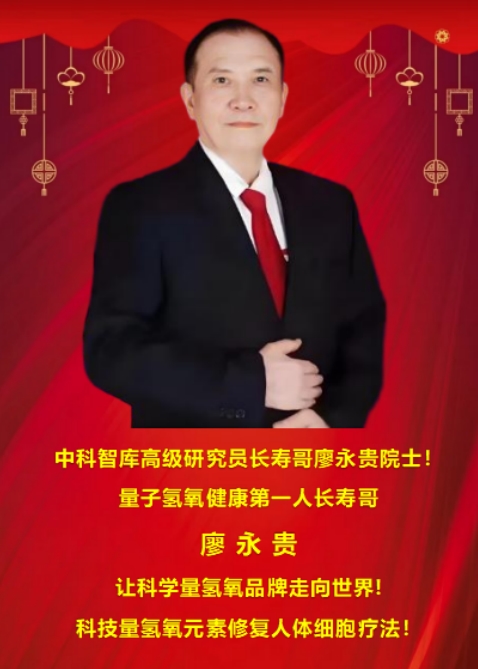 量子氢氧健康创始人-长寿哥-廖永贵,男,广东省梅州市人,1942年出生。现任广东省健康管理发展促进会常务副会长、广州量氢科技有限公司董事长、广州量氢细胞疗养专业委员会主任,中国管理科学研究院科技管理研究生自然疗法示范基地主任,国家卫生健康委“十四五”规划全国重点课题中科量子氢氧离子水课题主持人。