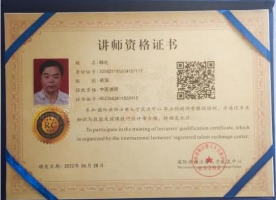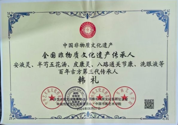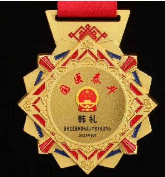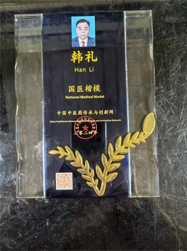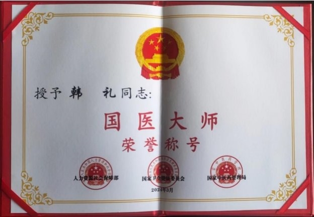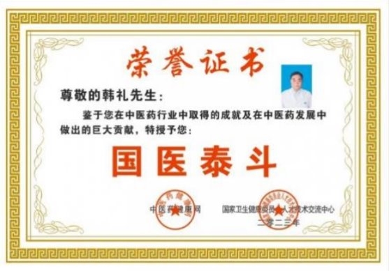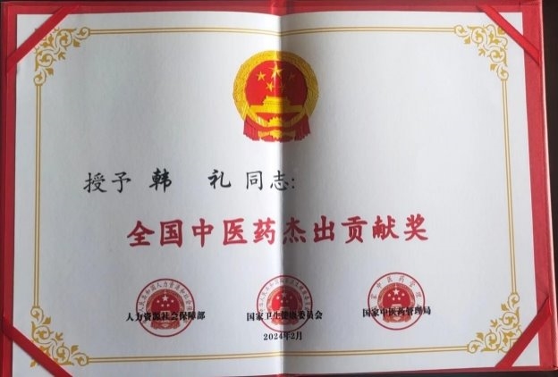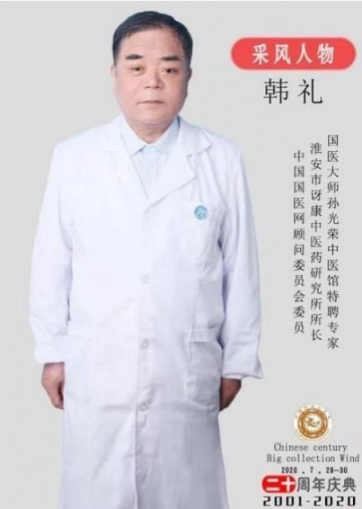 部分任职 目前受聘于中华医学临床研究会专家委员、中国医促会中老年保健专 业委员会委员,全国高科技质量管理督察、中国疑难病研究协会专家技 术委员会委员、全国健工委老干部健康指导委员会、北京华夏中医药 发展基金会专家委员会委员、北京华夏中医药发展基金会专家委员会 委员、健康保健医师,中国医师协会专家巡讲团讲师、全国首届医学泰 斗、全国国医名师、中医匠人、中华医师专家。研究成果被授予中医 药继承与创新奖,质量服务诚信 AAA 企业。,中国疑难病医学临床研究会专家技术委员,兼客座教授,世界中西医结合医学研究院院士,博士,全 国健工委中央老干部健康委保健医师。 学术成就: 一、治疗皮肤病的中药成果,讶肤灵原名(皮康灵)发明专利,能治愈湿诊 等诊,青春痘,痤疮,神经性皮炎,红斑狼疮,牛皮癣等癣及其他种顽固性皮 肤病。 二、八路通关节康,现名关节康能治愈肩周炎发明专利,颈椎病,腰椎盘 突出,风湿类风湿关节病,强直性脊柱炎,股骨头坏死等骨关节病。 三、上呼吸道疾病配方,安液灵,原名(呼吸康)发明专利能治愈鼻炎,咽 炎,口腔炎,牙炎,气管炎,食道炎、感冒、流感、肺炎、非典等呼吸道疾 病,对于冠状肺炎病毒也有很好的疗效。对于感冒、流感、非典、冠状 肺炎病毒能防能治。 四、心脑血管的配方,能治愈心肌炎、心膜炎、早搏、冠心病无须搭 桥、心梗、脑梗、头痛、头晕等。对于心脑血管病能防能治,只要发病 时即时用上此药生命就会有了保障,若昏迷症患者用了此药在 15 分钟 左右可清醒,此药是心脑血管患者保护神。 五、对于血液病也有很好的突破性进展,血项除血红蛋白和中性粒子细 胞外,其它的都可调理正常,就是这两项血项也有很大的研究进展。在不 远的将来我们有信心彻底解决。 六、对失眠,抑郁症,精神分裂症,急慢性头痛、头晕、用中药结合点穴 和挲穴疗法一般的在半到一个半疗程可治愈,不易复发。 七、眼病有百分之九十八的都可治愈,就是糖尿病的眼病也可还患者的 光明,白内障无须手术,一次还健康。 2007 年 7 月在北京人民大会堂召开的第六届中国科学家论坛上,提交 三项药学发明专利得了金牛奖。 2007 在政协礼堂召开的“首届中国医药卫生产业发展大会”提交的 “樟防搽剂临床应用”被评为“重点推广项目”并得奖杯。 2007 年 11 月被中国医促会中老年保健专业委员会吸收为专家委员会 委员。 2007 年首届中国医药卫生产业大会上荣获金杯奖,和全国人大委员长 吴阶平授予中国名医奖。 2008 年创办了淮安讶康中医药研究所有限公司。 2008 年 4 月被中华医学交流基金会授予“中华健康管理杰出人物”。 2008 年被多次邀请到澳门、澳大利亚、悉尼、新加坡、马来西亚等国 内外参加医学学术交流活动。 2008 年参加的“全国中医药名院名科名厂名店名医名药品牌战略论 坛” ,在会上提交的治疗皮肤病的《障防搽》皮康灵被评为“中医名 药”。 2020 年 4 月被中国管理科学研究院商学院聘为高级研究员,大国医药 智库成员。 2023 年 8 月被授予“国医泰斗”荣誉称号。 在庆祝中国共产党成立 100 周年大型主题活动中,韩礼所长被推选为时 代榜样人物,被国家中医药文化委员会授予金口碑著名中医功勋人物,中 医传承非遗技师,等部门的奖励。 目前,国家卫生健康委医药卫生基金管理办公室科研成果选评活动中公 示中,淮安市讶康中医药研究所韩礼研发的韩氏安液灵(半芍五花汤)从 科学性、规范性、创新性和应用价值等方面达到国家科研研究标准,具 有显著的医学价值、科学效益和应用价值。荣获国家卫健委“十三 五”全国重点课题科研成果一等奖!