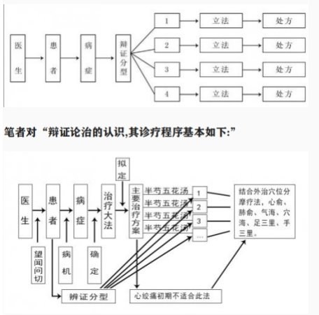 一、无论是同病异治还是异病同治都要围绕辩证论治这个纲 中医院校和中医临床均强调中医“辩证论治”辩证施治确实是中医宝 库中的奇葩,很多疾病在辩证施治的指导下,获得良好的疗效。因此,近 年来现代医学也提出“个体化医疗”的观点来修整自身的医学理论。 现代中医人士理解的“辩证论治”是否完全正确还应该作进一步研究 和探讨,以现代课本所述的辩证论治模式,就是西医的辩证论治的模板, 注重个性病机有余,关注复性病机不多,只注重临床中的局限性,单一性, 或略了病机的复杂性。这完全着重于局限性,正因如此,不利于临床治疗 的效果,也不利于正确传承。在中医临床上用单一性辩证论治的治疗方 法仍不在少数。 我们认为要想传承好和发展好中国的中医药事业的传承,还是要根据临 床实际实践为导向,以现代中医药科学为主导,以现代中医学为基础,但 不可教条,要灵活应用。 比如:《素问至真要大论》的病机十九条中记载:“帝曰,愿闻病机何如? 岐伯曰:诸风掉眩,皆属于肝,诸寒收引,皆属于肾;诸呕吐酸,暴注下迫,皆 属于热。”这些辩的不错,治的立论也没有错,但用祛风祛寒祛热的立 方,我们认为不是很好的唯一的方法。在这里我们认为还不如用国医大 师孙光荣的中医药的中和调和法的疗效好。 难道对于复杂人体的病机只有照此十九条的病机法去治疗病症吗?非也 《内经》是通过列举、问签的形式告诫我们分析人体疾病,应归纳、总 结、抓住主要矛盾,求同存异,总体把握。 医圣张仲景在《伤寒论》太阳经证中共设立了 16 个处方,其中 8 个处 方治疗太阳中风(表虚),8 个处方太阳伤寒(表实)。 张仲景抓住太阳中风(表虚)证发热、恶寒,有汗的主症设立了“桂枝 汤”为主方,桂枝三两(去皮)芍药三两、甘草二两(炙)生姜三两(切片) 大枣十二枚。 8 个治疗表虚症的处方汤是在桂枝汤基础上衍生而来,什么喘家(1)作桂 枝汤加厚朴二两,杏仁五十枚(去皮尖)突然发热、咳嗽,有少量痰,伴有 腹泻,黄色唐便,精神萎顿,还要加僵蚕一两,前胡一两。又是什么喉间有 水鸡声,腹仍满,膈动微减,口青色稍退,脉滑不数,肺气仍闭,湿痰阻滞的用 射干麻黄汤加减,处方,桂枝二两、白芍二两五分、炙草二两、生姜三 两、大枣十二枚、厚朴二两、杏仁十五粒,僵蚕二两,前胡二两一剂。还 有什么?全潮润,足欠湿,腹满已减,二便如前,面色青白,右肺水泡音较多, 左肺较少,脉沉滑,舌淡苔退。 处方:西洋参二两,川朴二两五,法半夏三分,灸草一两,生姜十二片,橘红二 两,二剂等等。这些配方太烦了。以上这些我把归纳起来用半芍五花汤 结合外涂穴位疗法可以 7 症共同使用,而且疗效更理想。 根据医学中张仲景的学术思想,还是值得肯定的,充分体现了辩证(病)与 辩症相结合的整体治疗观。因此,张仲景应该是中医诊断学的范例,但在 这些方面能结合自己的创造性对诊和疗方面会更方便易懂些,而且疗效 会更好。 近代中医对“辩证论治”的认识,诊疗程序基本如下(视图)。