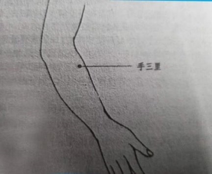 手三里穴位在弦桡肌凹陷处,肘腕连线上 1/0 与下 5/6 交界处,即曲池下 2 寸(如图)