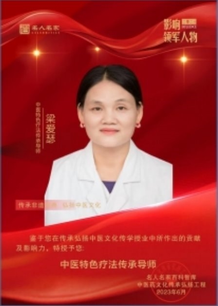 健康是人类永恒的追求。实施健康中国战略,是从源头维护人民健康。中医药学凝聚着深邃的哲学智慧和中华民族几千年的健康养生理念及其实践经验。中医药起源于民间,立足于基层,无数基层中医人坚守独具匠心的中医情怀、用独特的思维和方法解决了很多疑难病症,用自己高超的医技书写了很多传奇故事。在基层中医这个藏龙卧虎队伍中,广西中医特色疗法传承导师--梁爱瑟,是基层中医的一面旗帜,他以“精”“诚”引领自己的医学道路,执着追求,秉承“仁术慈心,修身济众”的信念守护人民健康。是基层群众的健康“守门人”,健康中国路上的筑梦者。