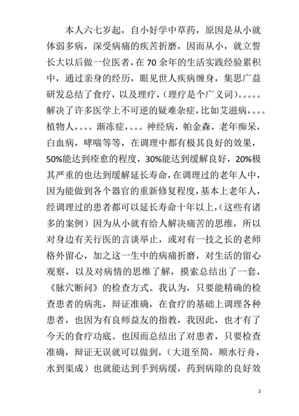 笔者自小体弱多病,邻里施小草,使吾疾去如风,那幼时立誓,壮年学步杏林中。谁知途路也曾涟漪雨,风餐水暖伴崖壁,但坦途半世路崎岖,几许生死、对苍天磕头作揖个一!大路平坦也无奇,风吹雨打日晒雨淋多浸体虚,不知保养、虚、寒、湿、凝、淤、堵、瘤、癌邪害自身体,最终:历时房颤,冠心病,心脑梗塞,中风,肩颈腰腿,痛风,肾衰症,褐渴症,头昏眼花病症,老年痴呆,肝硬化,肺结核,肠胃痔疮,头上流脚上长疮!从上至下体无完肤,治路无门。为活命求生?结合本民族特色摸索总结出一套“脉穴断问”的查疾方式。俗言药苦,自身体验演变出序列理疗食疗心脑梗塞,帕金森,老年痴呆,精神分裂症,败血症,腰椎,痛风,五脏六腑皆以理疗食疗各种疾病的方案,也为少时的誓言打下了转换食疗的基础。在几十年的理疗食疗经验中感觉,一病皆有五花八门不同的病兆,首先分清虚寒、湿、凝、淤、堵、瘤、癌,无论病体是阴与阳,或者阴阳交杂或春夏秋冬,把病兆探准分清楚,该从哪儿着手?起止有序,很大一部分病兆都是可以迎刃而解的,即便不能痊愈,也有很好的缓解效果。